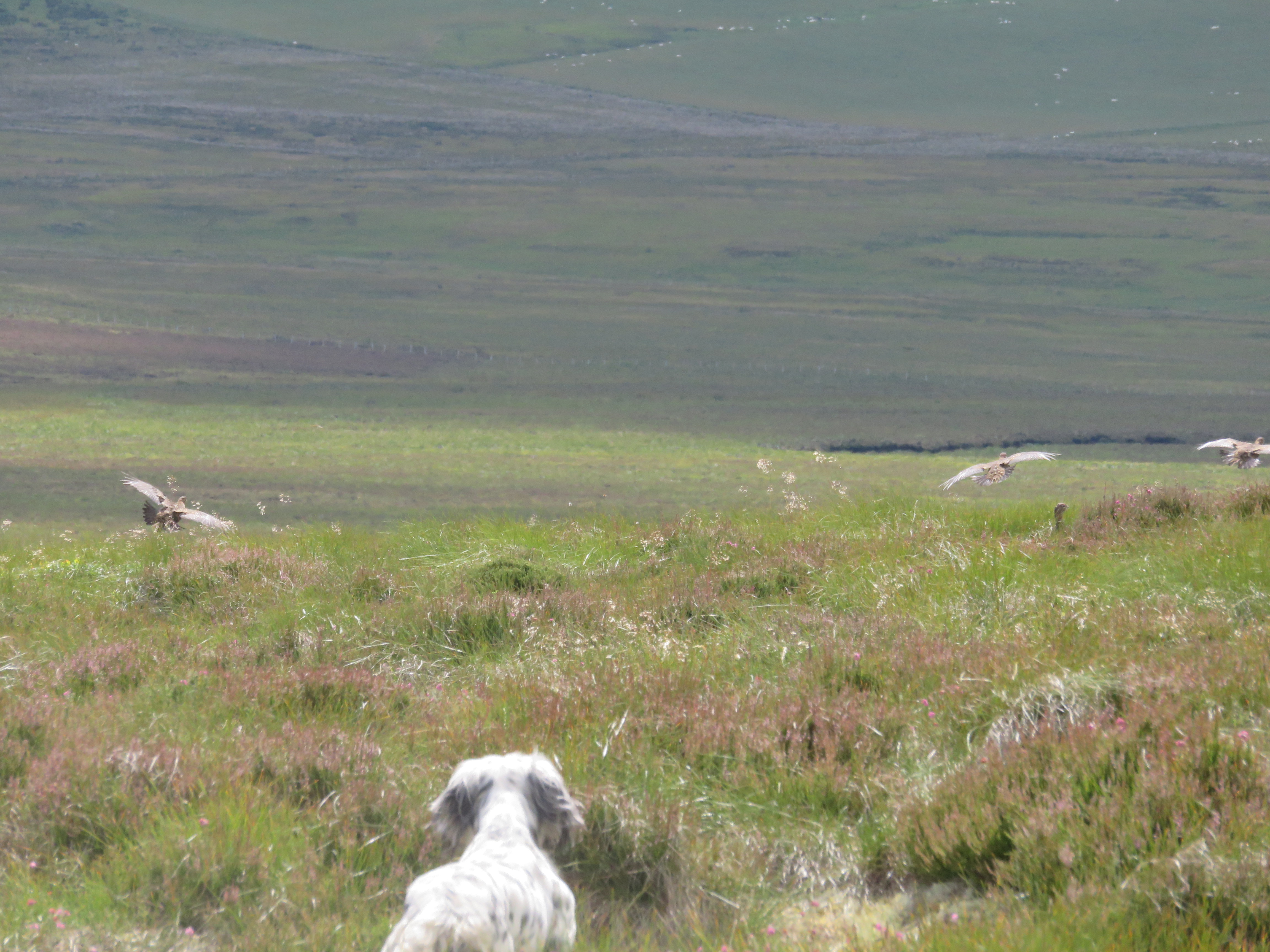 Gala working on to produce her grouse. Some of the covey take flight, some still remain on the ground.